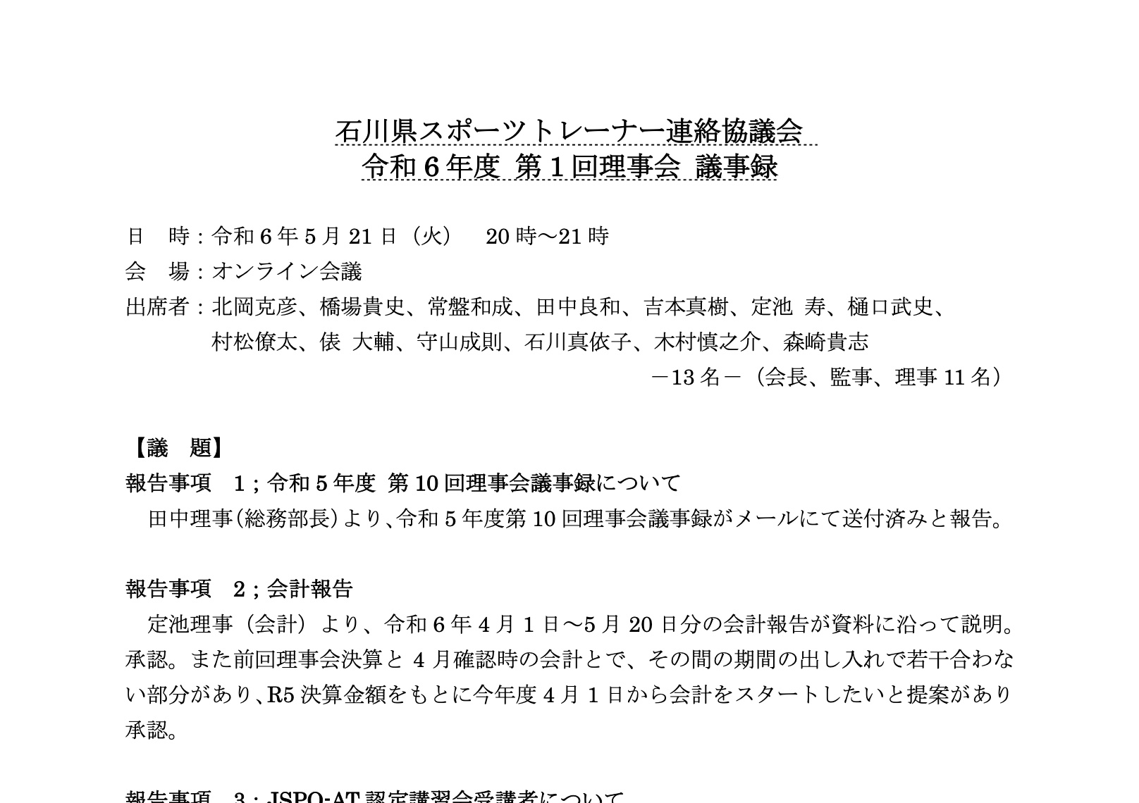 IST令和6年度 第1回理事会 活動報告 2024.06.23 令和6年5月21日石川スポーツトレーナー連絡協議会 令和6年度 第1回理事会が開催されました。 IST令和6年度 第1回理事会-議事録ダウンロード